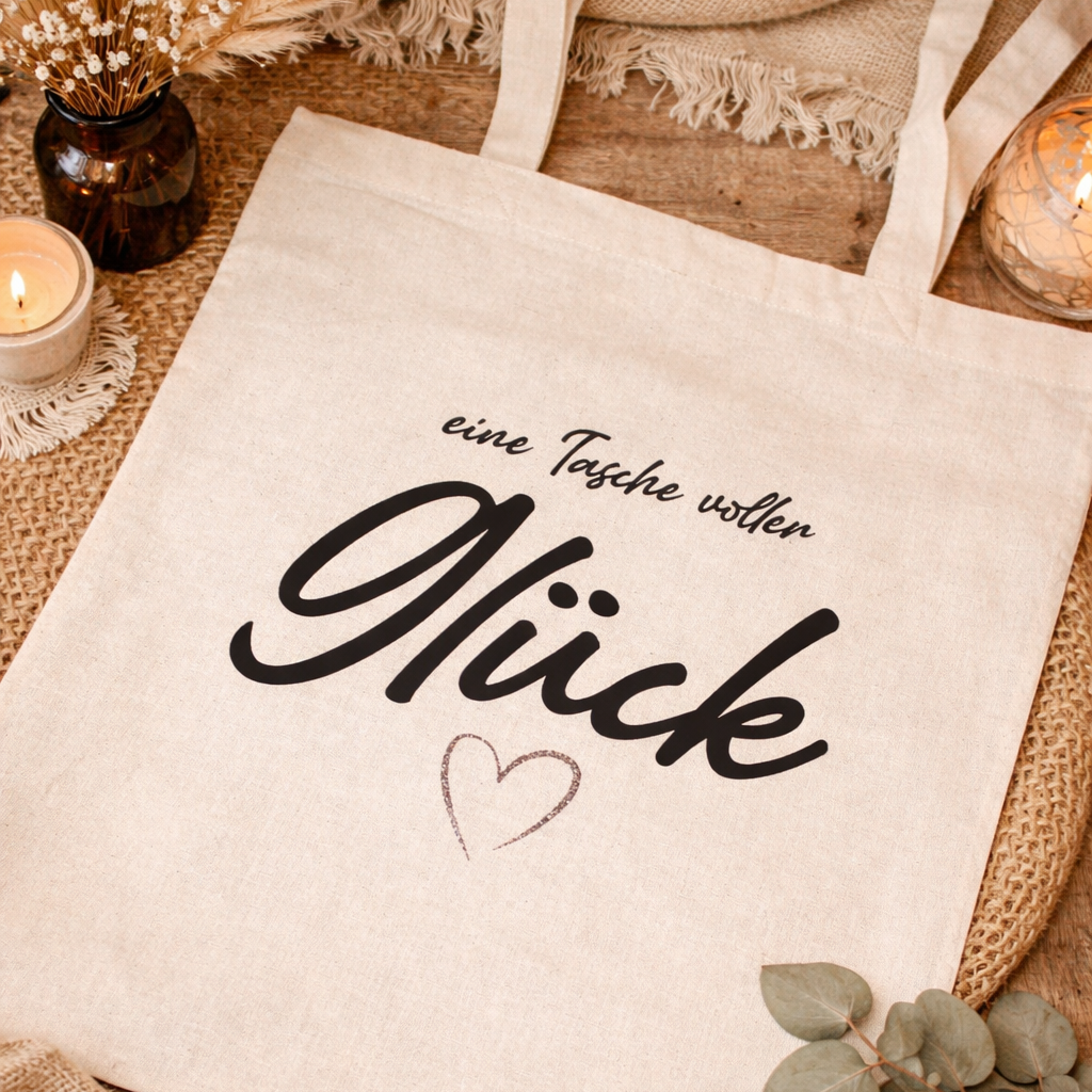Mit unsere Baumwolltasche und dem wunderschönen Spruch : "Eine Tasche voller Glück" fängt es an.