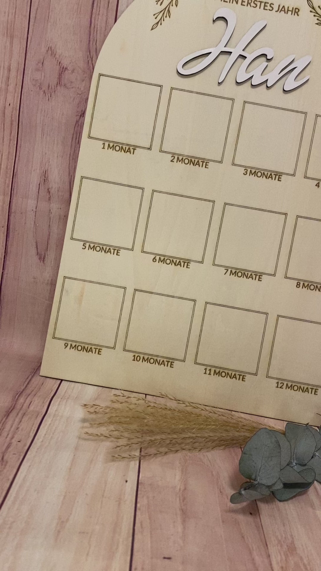 Die Tafel bietet zwölf Felder für Monatsfotos (je 5,5 x 5,5 cm) und präsentiert den Namen deines Kindes in ansprechender 3D-Optik. Eine filigrane Blumenranke ziert den oberen Bereich und verleiht dem Stück zeitlose Schönheit.
