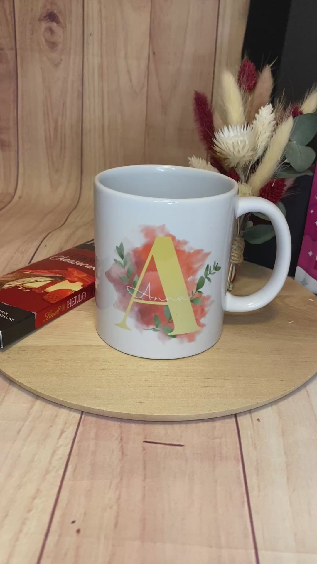 Sie enthält eine personalisierte Tasse mit individuellem Motiv (beidseitig bedruckt – perfekt für Links- und Rechtshänder), einen zarten handgemachten Trockenblumenstrauß, köstliche Schokolade zum Naschen und entspannenden Badezusatz für pure Entspannung.