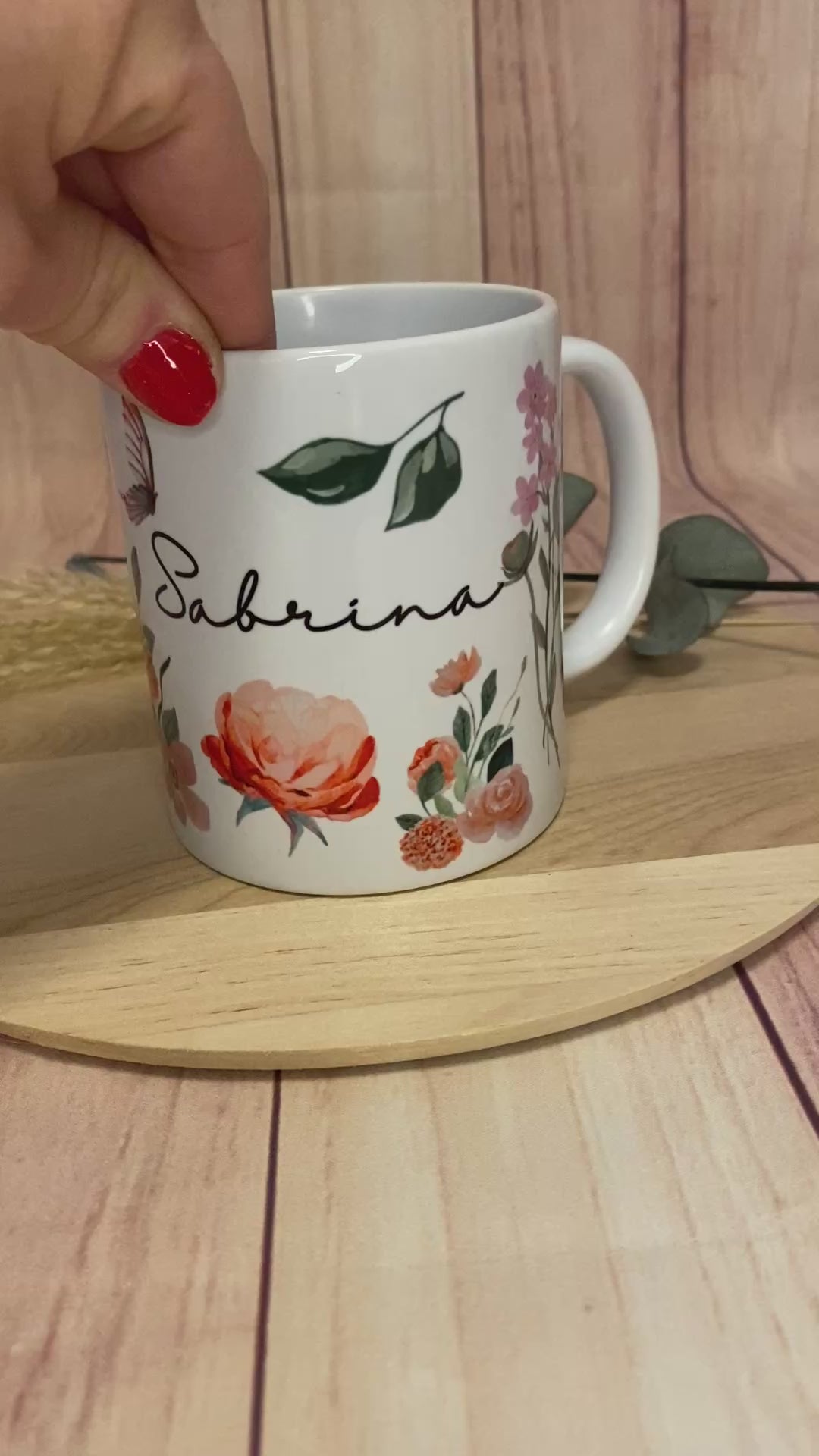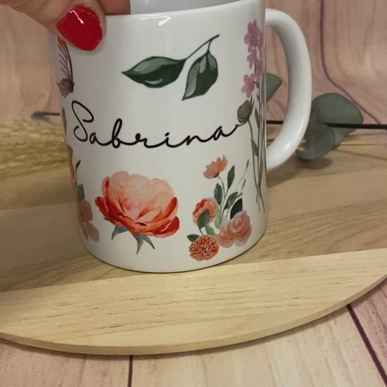 Das zarte Blumenmotiv wird durch einen individuellen Namen ergänzt und macht diese Tasse zu einem einzigartigen Begleiter im Alltag.